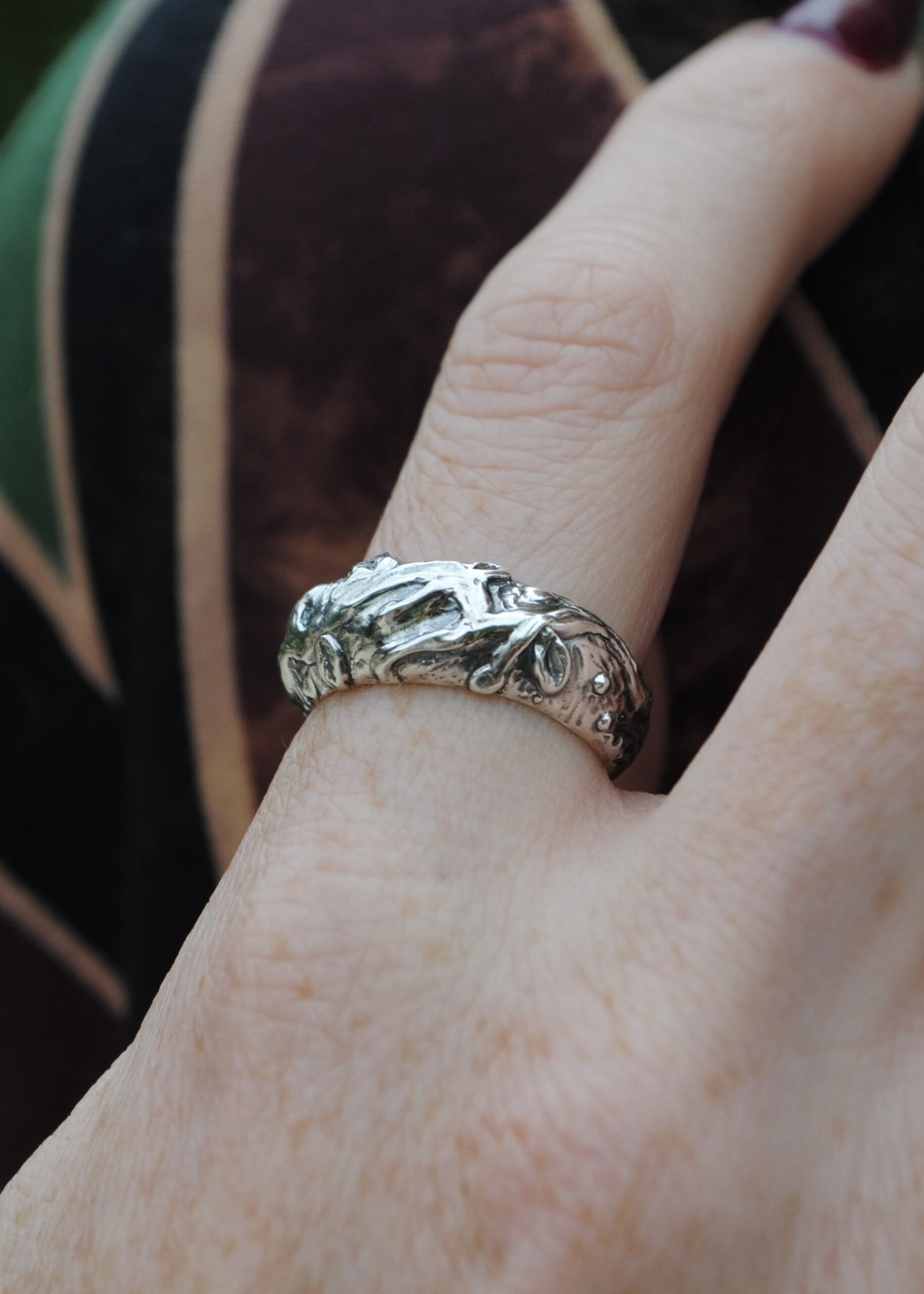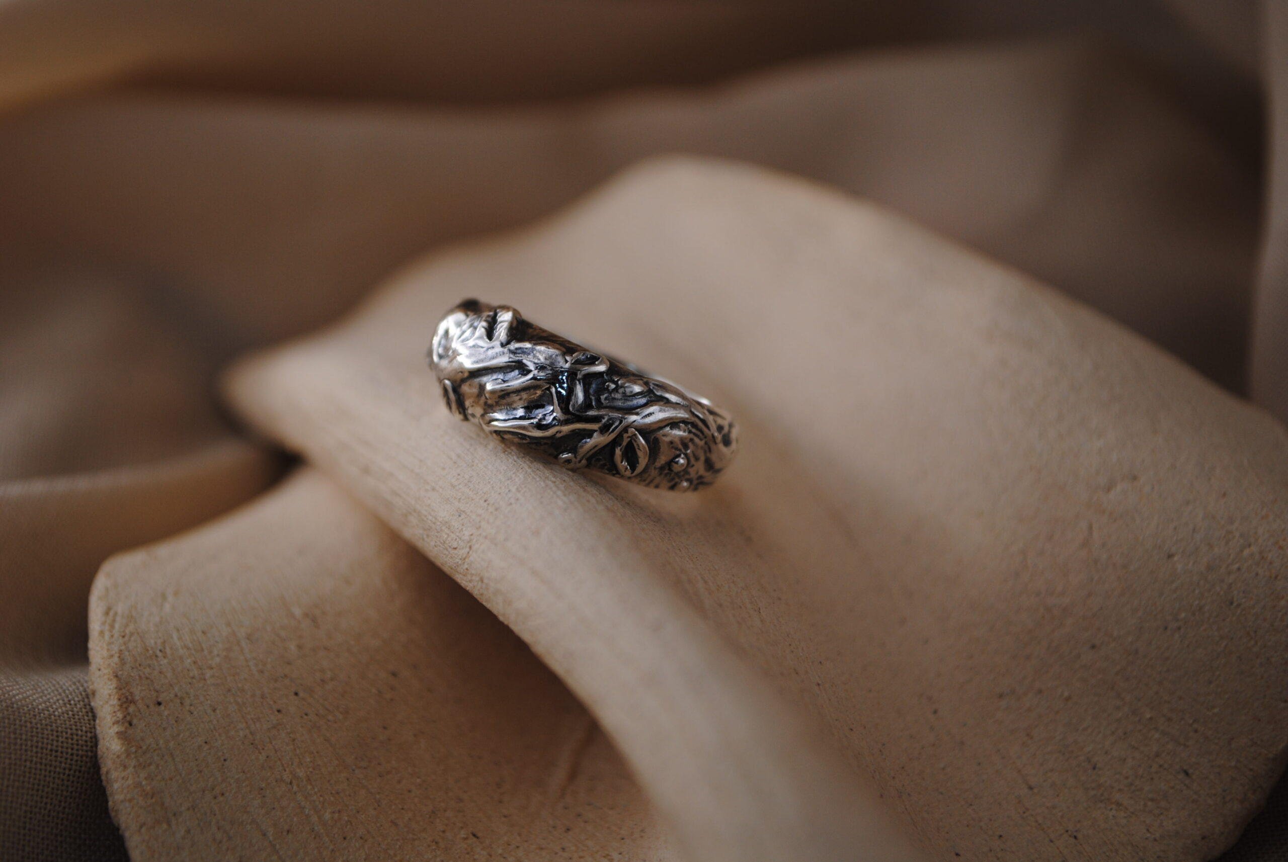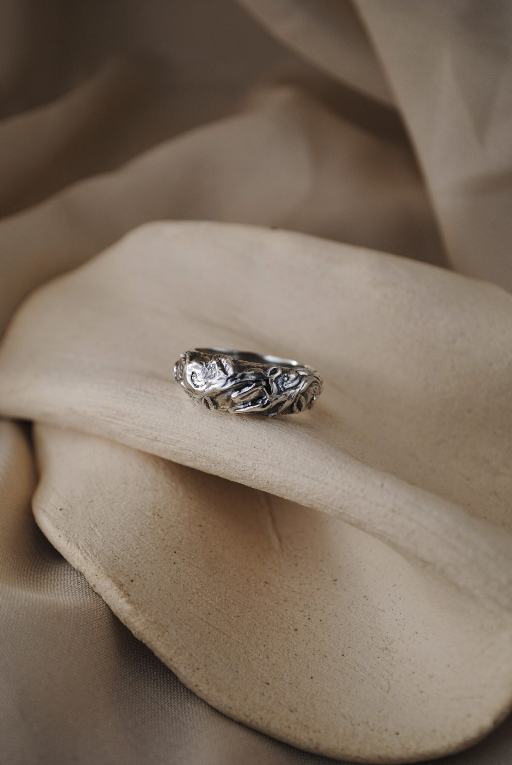 Anillo estilo bombé con modelado orgánico de motivos florales. Pieza única.