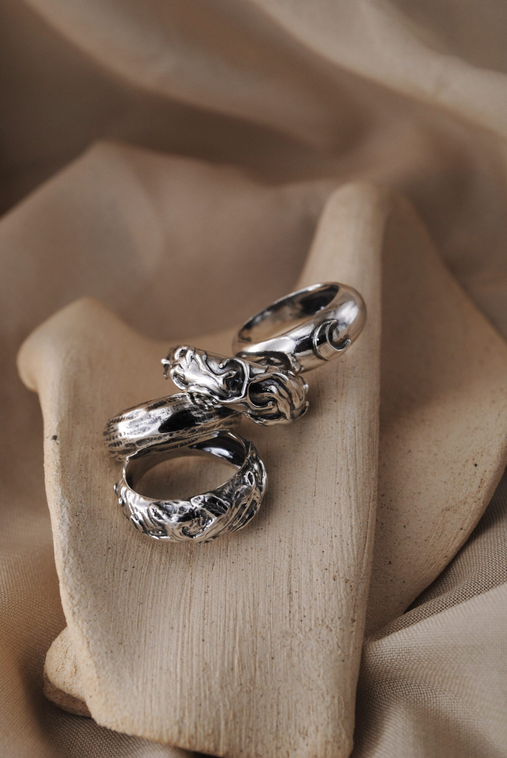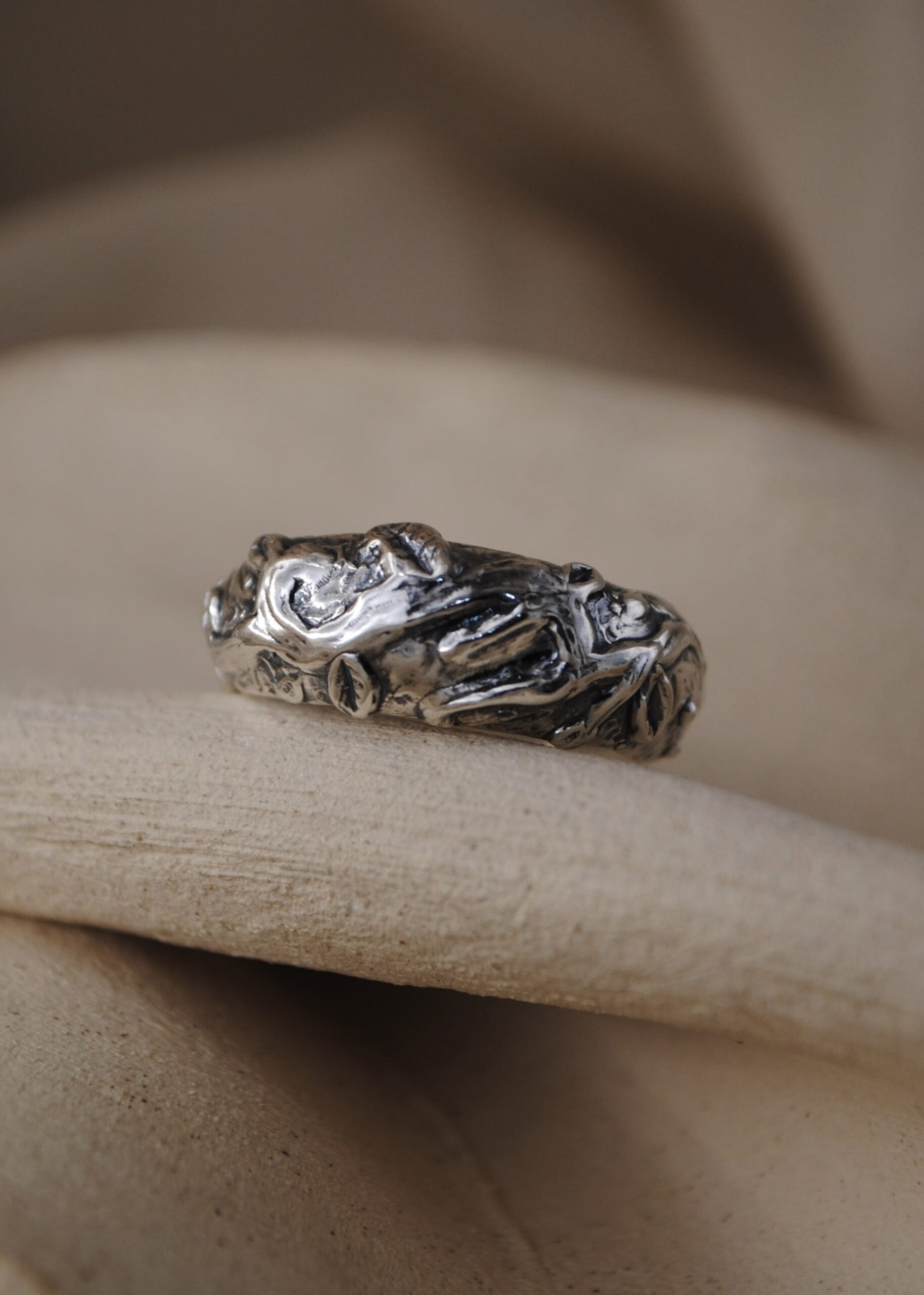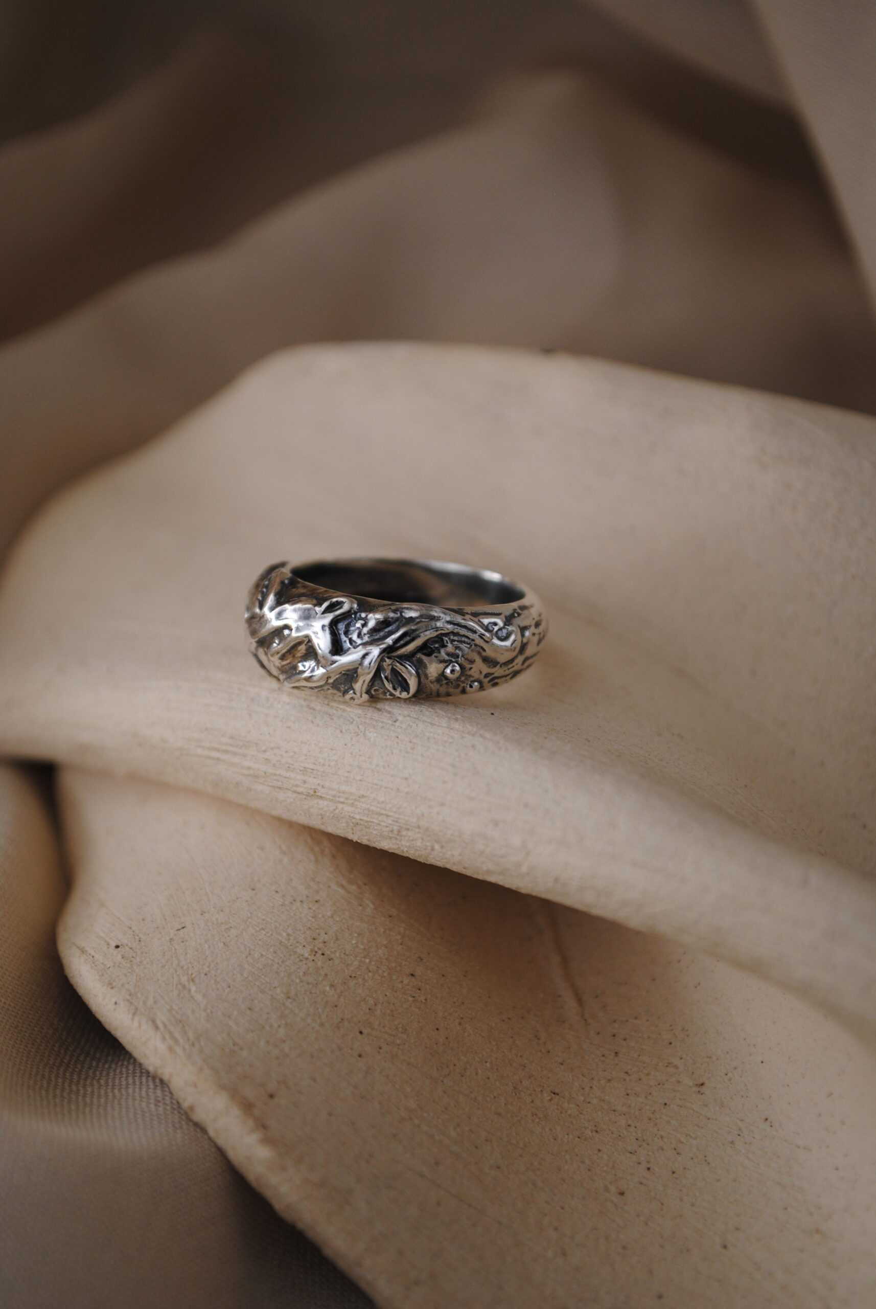 Anillo estilo bombé con modelado orgánico de motivos florales. Pieza única.