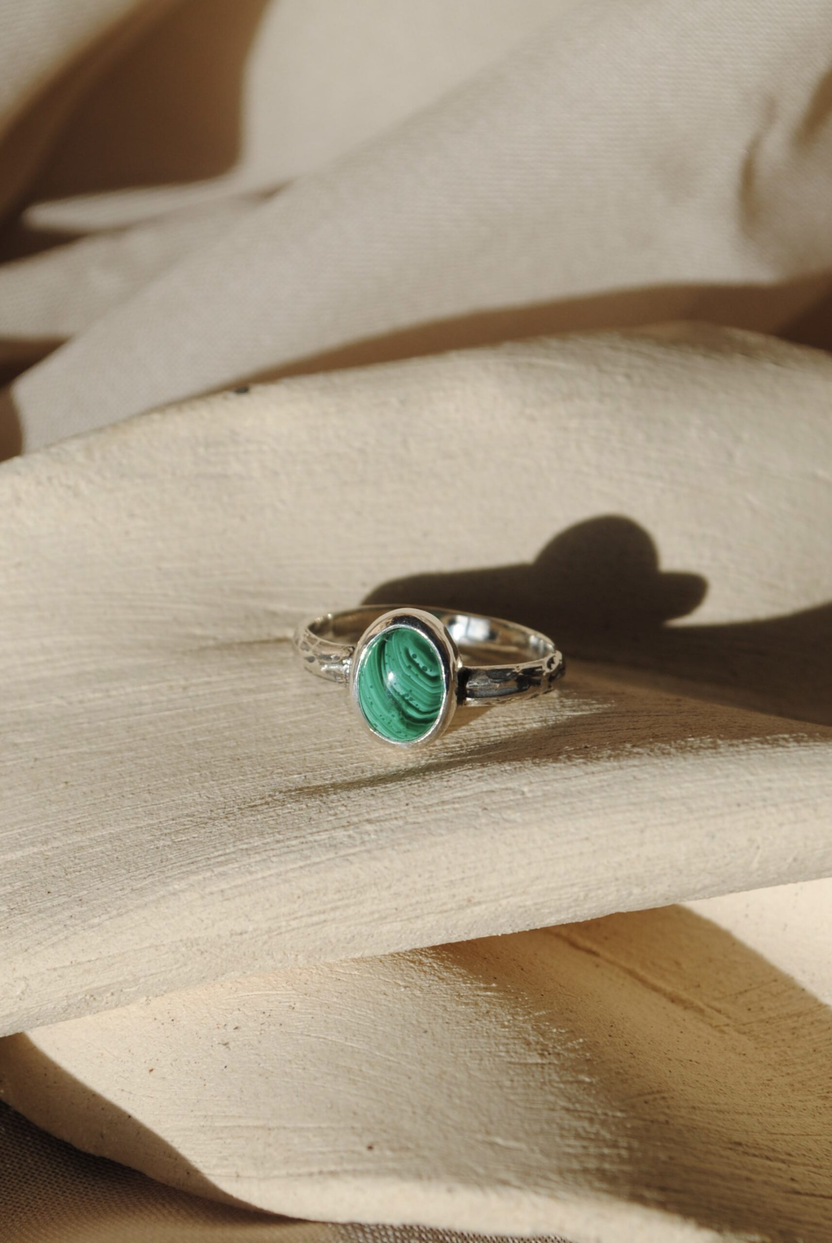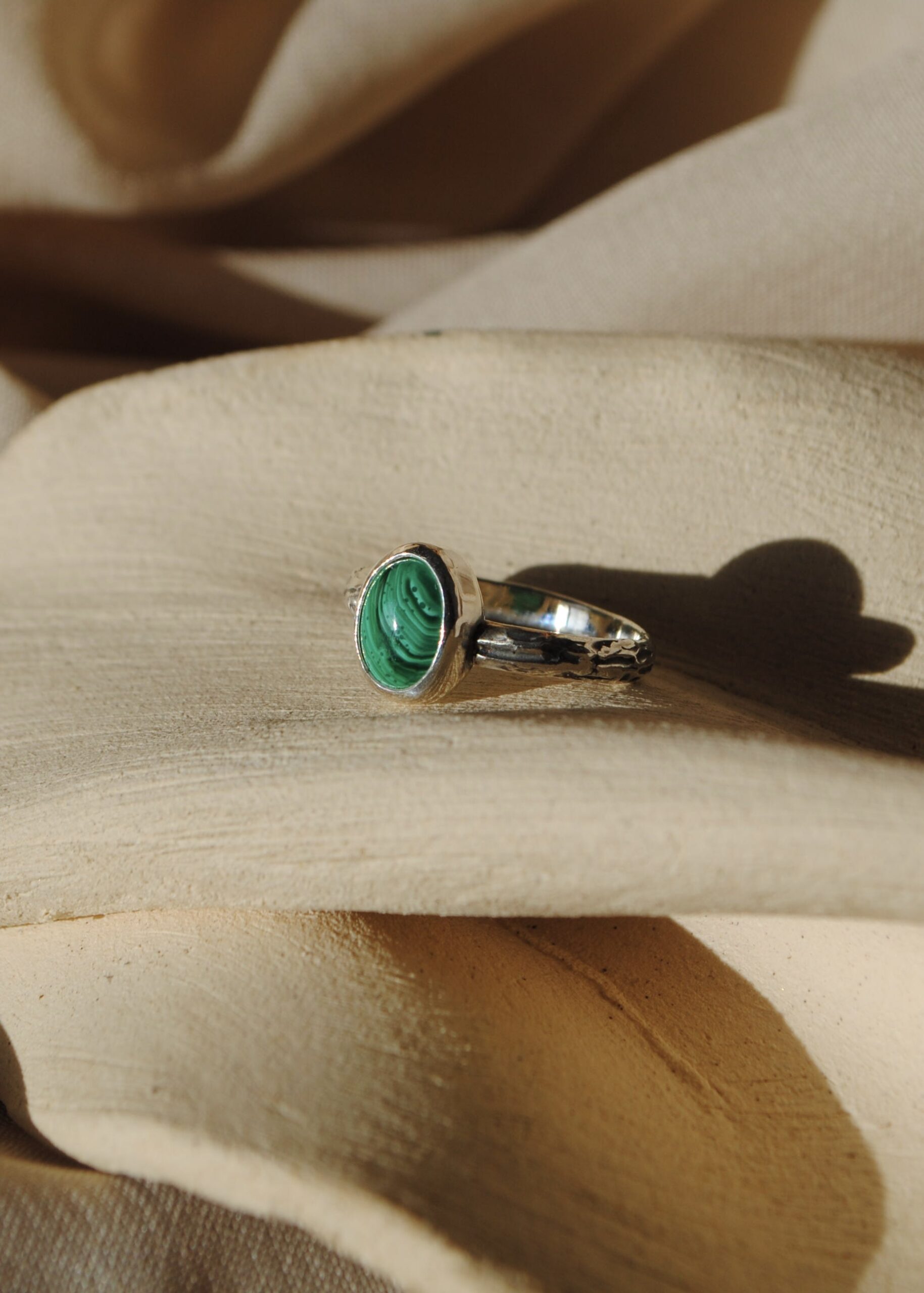 Anillo con piedra malaquita y brazo con textura orgánica.