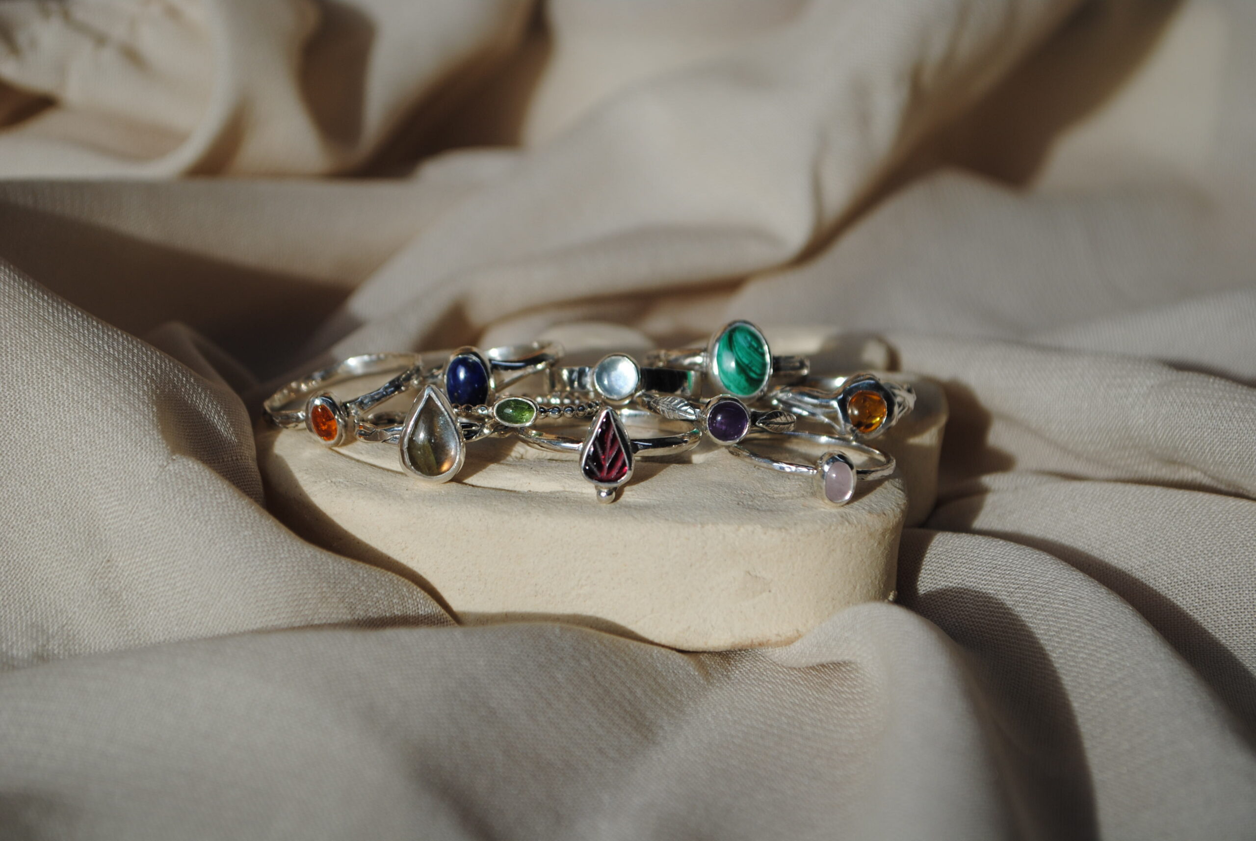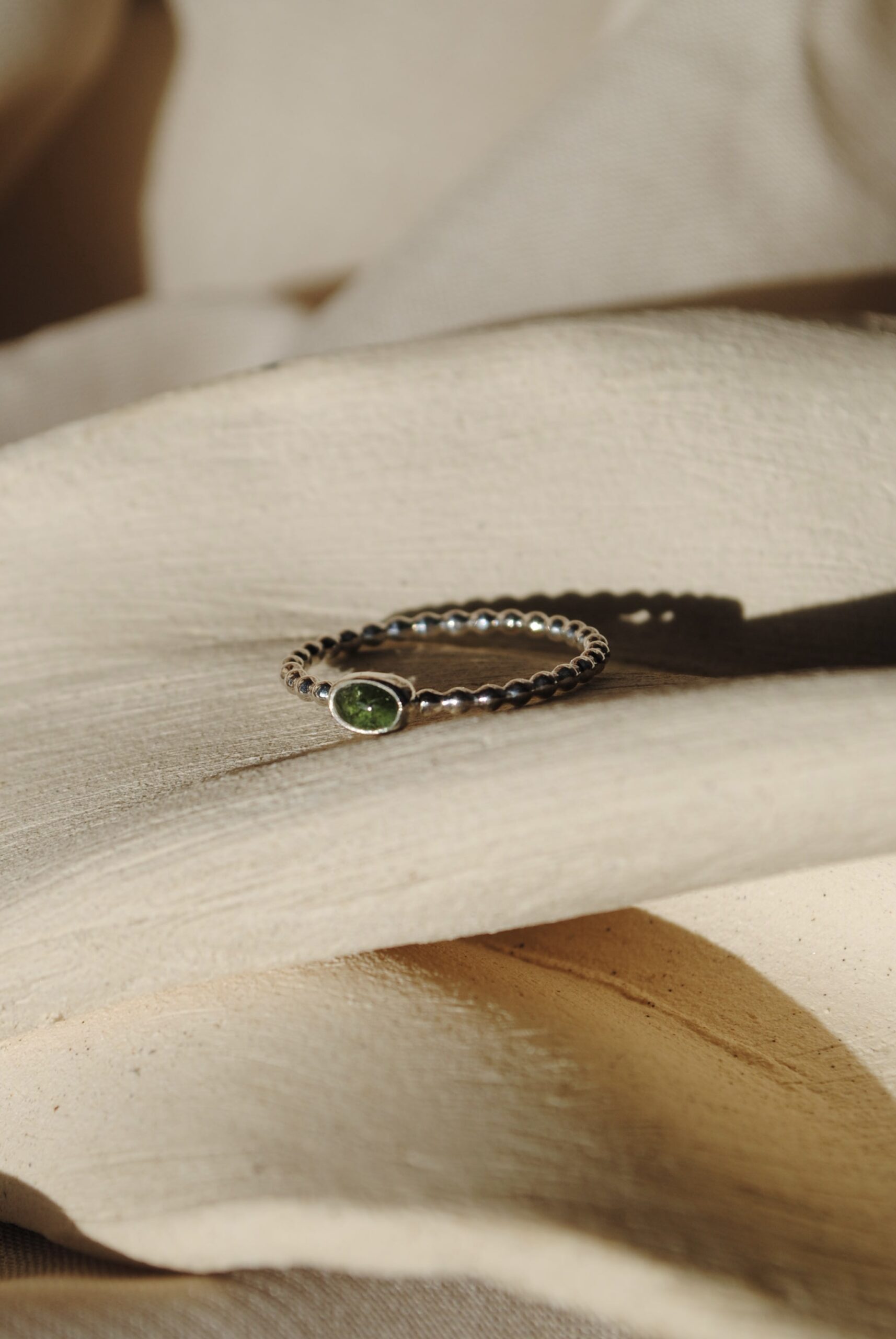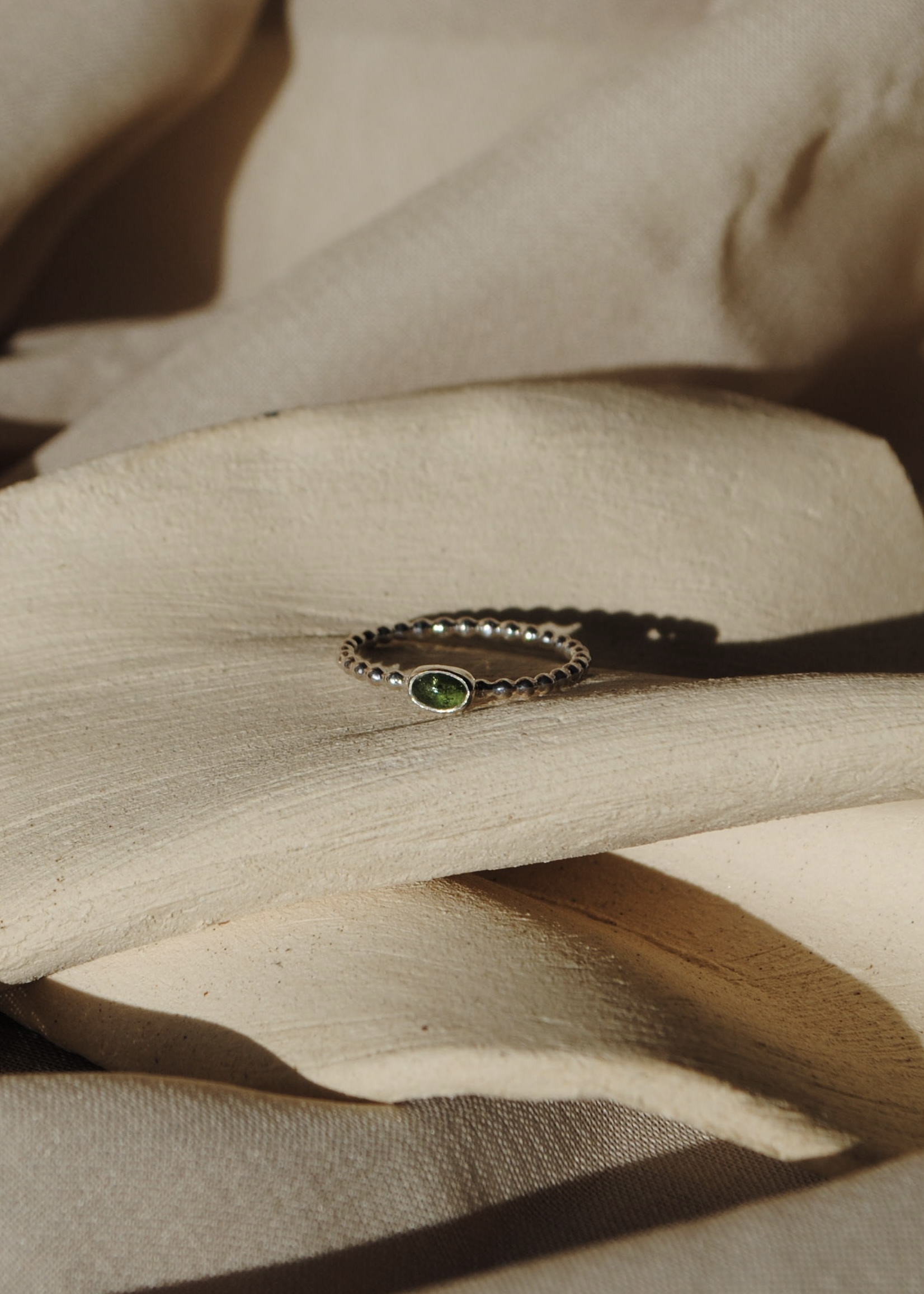 Anillo muy fino con brazo de bolitas y piedra Turmalina verde