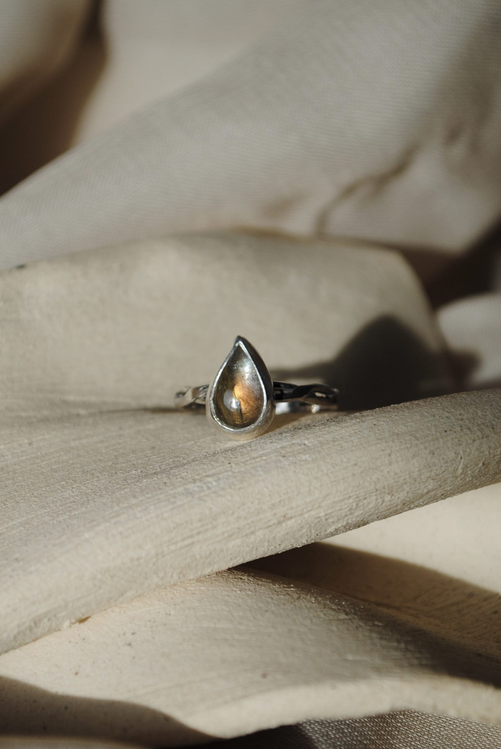 Anillo con piedra labradorita cálida y brazo trenzado.